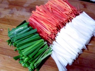 此外還要準(zhǔn)備大一點(diǎn)的胡蘿卜1根,白蘿卜1個(gè)切個(gè)5厘米長(zhǎng)的絲,韮菜切成5厘米長(zhǎng)的段,上圖。