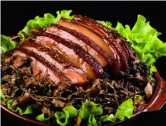 8、鋪上炒好的梅干菜,上鍋蒸或者砂鍋煨2小時,高壓鍋更好,省事。