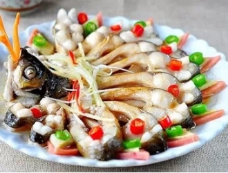 7、裝飾好,用蔥、姜絲擺在魚頭后面,燒熱油澆在上面(可以不做)。