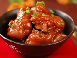 食材:豬蹄1只、腐乳8塊、油適量、鹽適量、腐乳汁1湯匙、冰糖4顆、姜3片、蔥3段、八角1個、生抽1湯匙、老抽1/3湯匙、料酒1湯匙、雞精1/3茶匙